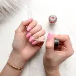 1. ラメピンク(上羽絵惣 胡粉ネイル「光琳梅」)のマニキュアを爪全体に塗布します。